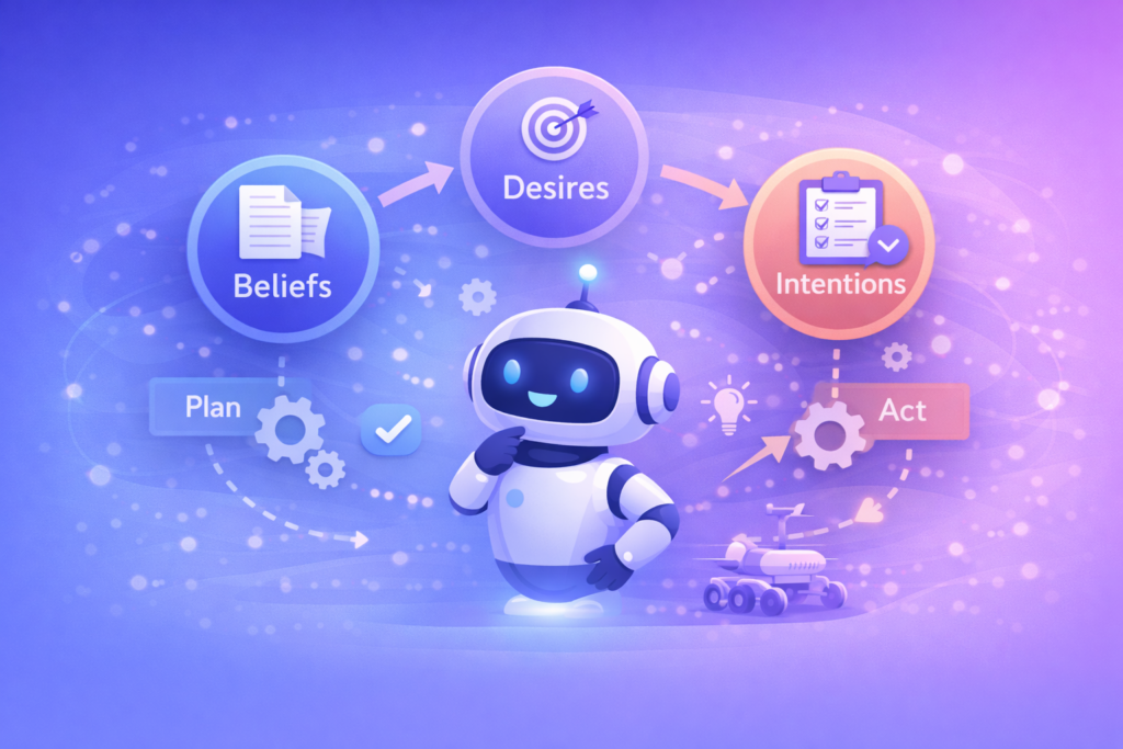 - 意圖:決定發送邀請函並預訂會議室 A(因為 B 被佔用)。如果後來發現會議室 A 也滿了(信念更新),它會放棄當前的意圖,重新規劃(如改期)。
