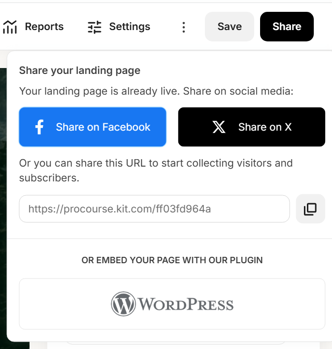 - 確認所有設定後,點擊右上方的 Share按鈕即可發佈你的 Landing Page。