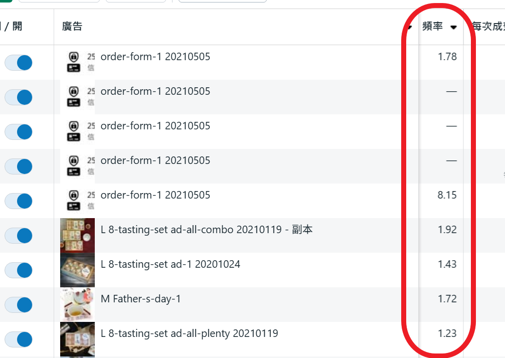 我建議大家就算是賣同一種產品, 應該每星期做一次改動或加入新廣告, 從而保持新鮮感. 另外, 你亦可以在廣告管理員 (Ads Manager)的廣告層 (Ad) 裡選擇投遞欄 (Column: Delivery)以查看(Frequency), 如果Frequency太高, 意味著人均看過你的廣告太多次. 你應該考慮轉變廣告.