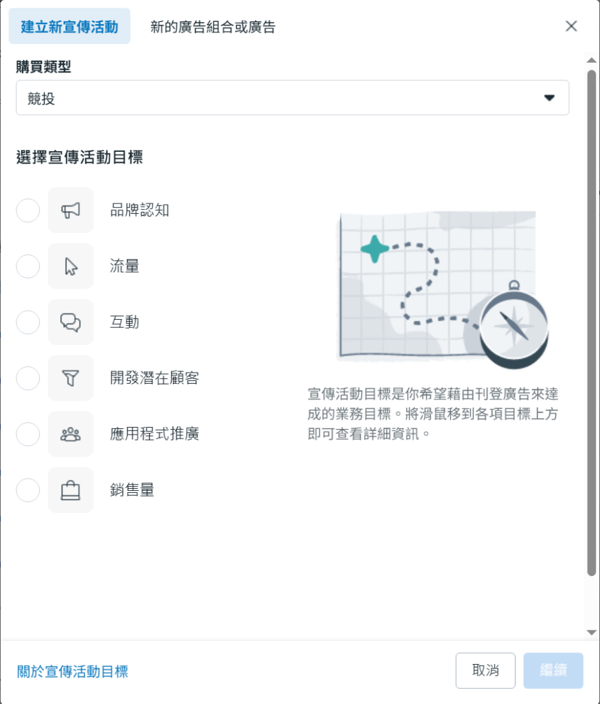 你會看到一個建立行銷活動的介面, 因為是示範關係, 所以隨便選一個便好, 例如是”品牌認知”. 按”繼續”.