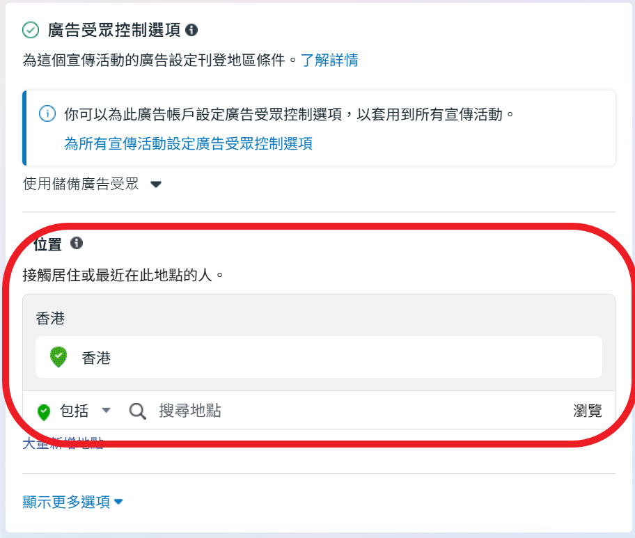 (地點在廣告受眾控制選項裏選擇)