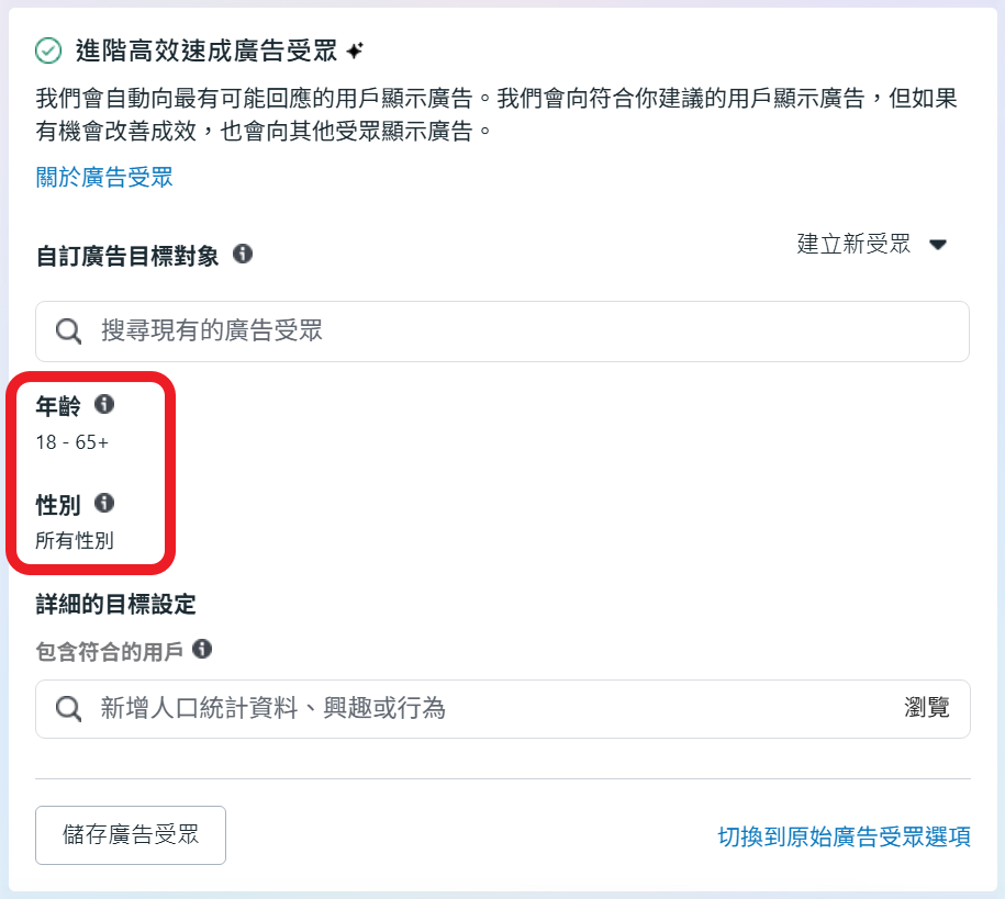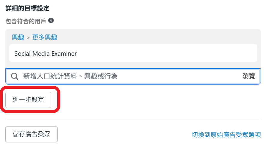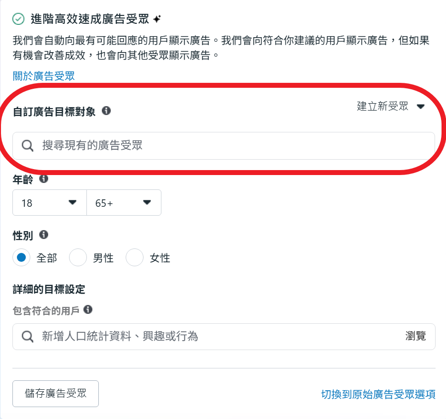 除了設定詳細的人口統計資料興趣和行為之外, 你也可以在頂部設定自訂廣告目標受眾.