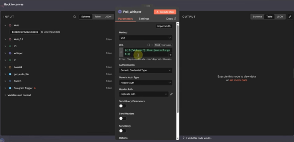 5. Body Parameters: 選擇 JSON,並填入以下內容:{ "version": "4d507972...", // 請填入 Whisper Large-v3 的 version ID (可在 Replicate 官網找到) "input": { "audio": "{{ $json.audio_base64 }}", "model": "large-v3", "language": "zh", // 強制指定中文,避免將廣東話識別成英文 "temperature": 0 } }