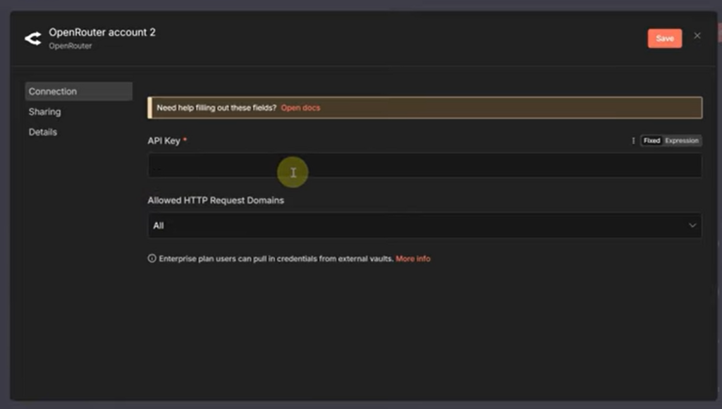 4. API Key: 建立 Credential 並填入 OpenRouter Key。