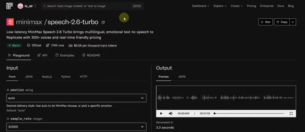 文字生成後,我們要讓她「說」出來。這裡我們再次使用 Replicate。
