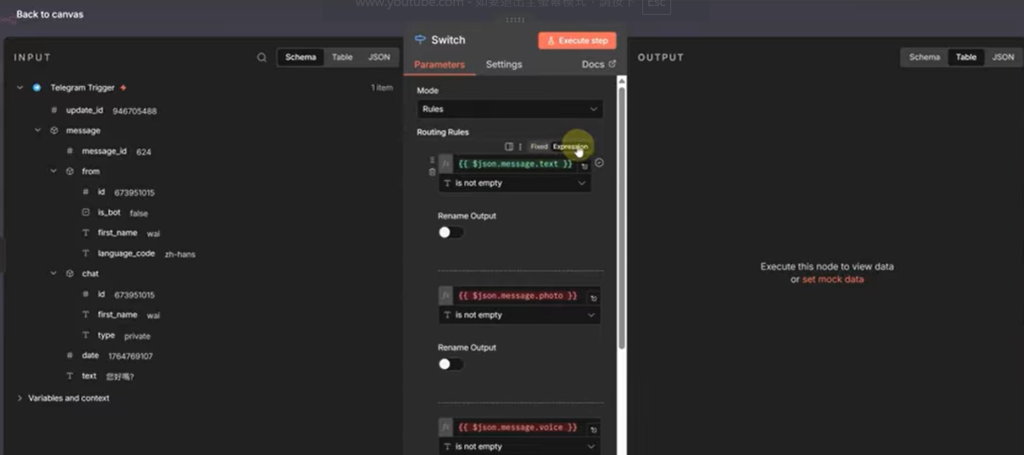 1. 在 Workflow 最開頭 (Telegram Trigger 之後),插入一個 Switch 節點。