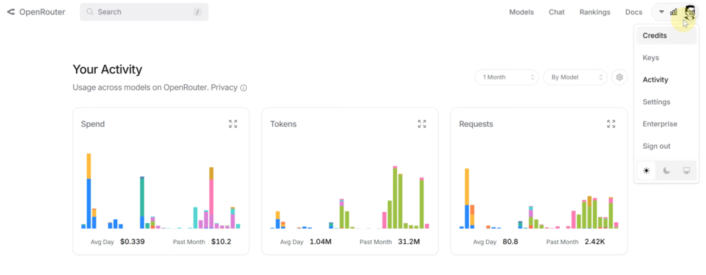 登入後,點選右上角頭像,選擇 “Credits”。 這裡是資金管理頁面。OpenRouter 採「預付制 (Pay-as-you-go)」,用多少扣多少,無過期問題。
