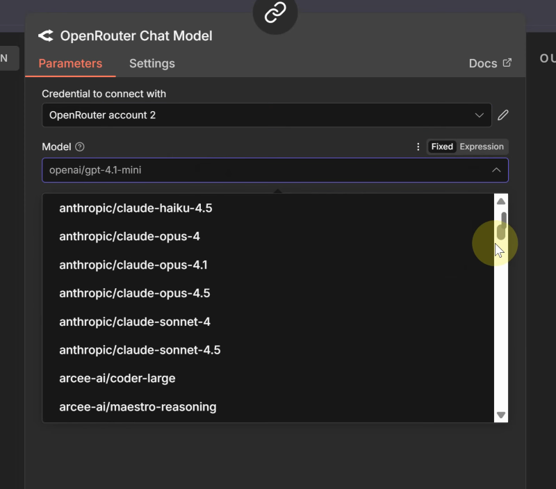 - 點擊下拉選單,n8n 會透過 API 自動抓取 OpenRouter 可用模型列表